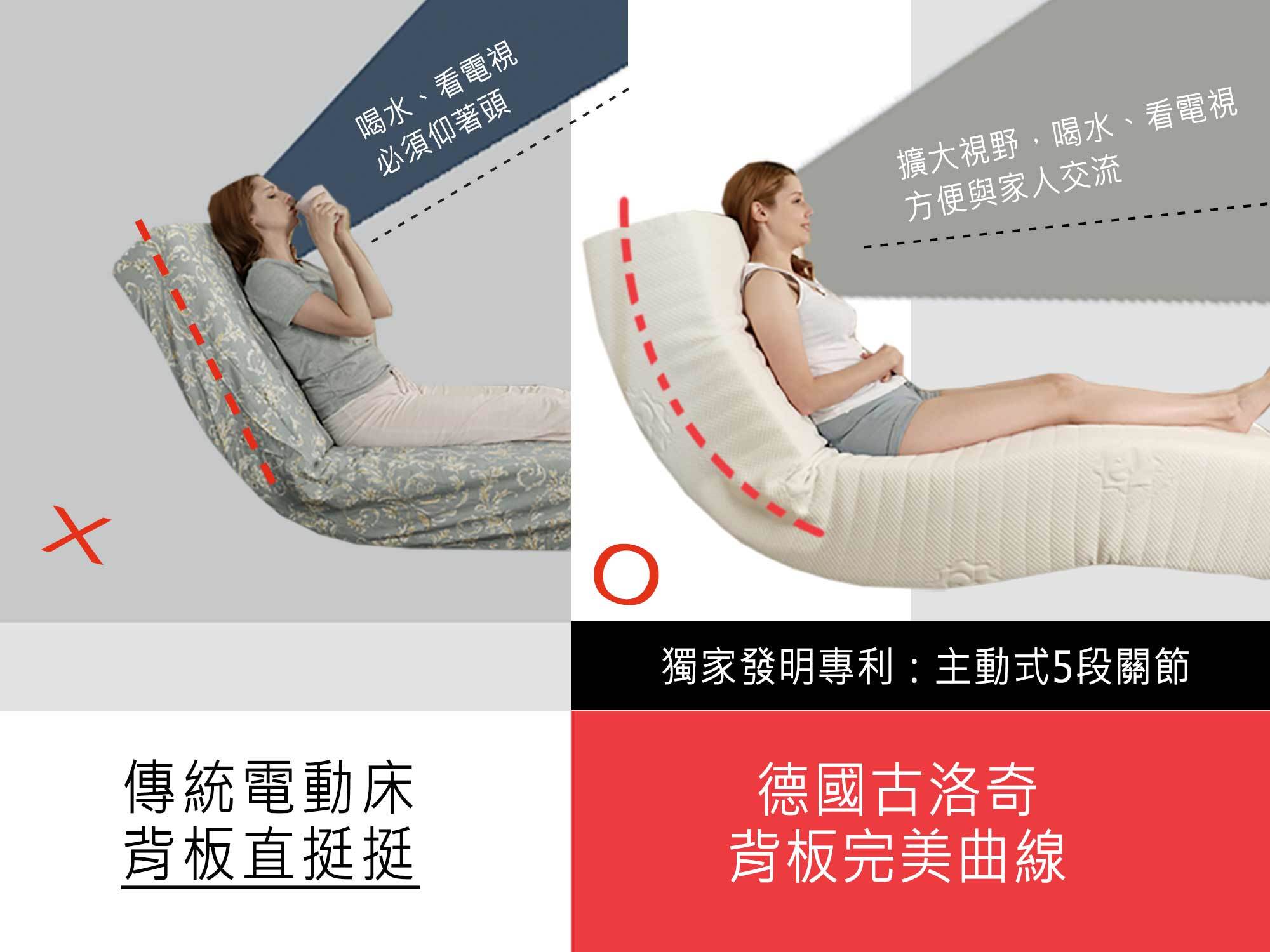 注意:古洛奇獨家專利:主動式5段關節,背板升起時自然形成弧度,完美貼合身形,是市面上唯一人體工學「背板有弧度」電動床。舊款4段關節背板直挺挺;舊款被動式5段關節,設計落伍,利用體重壓出弧度的設計,體重輕的人躺上去,背板一點反應都沒有,一樣直挺挺。