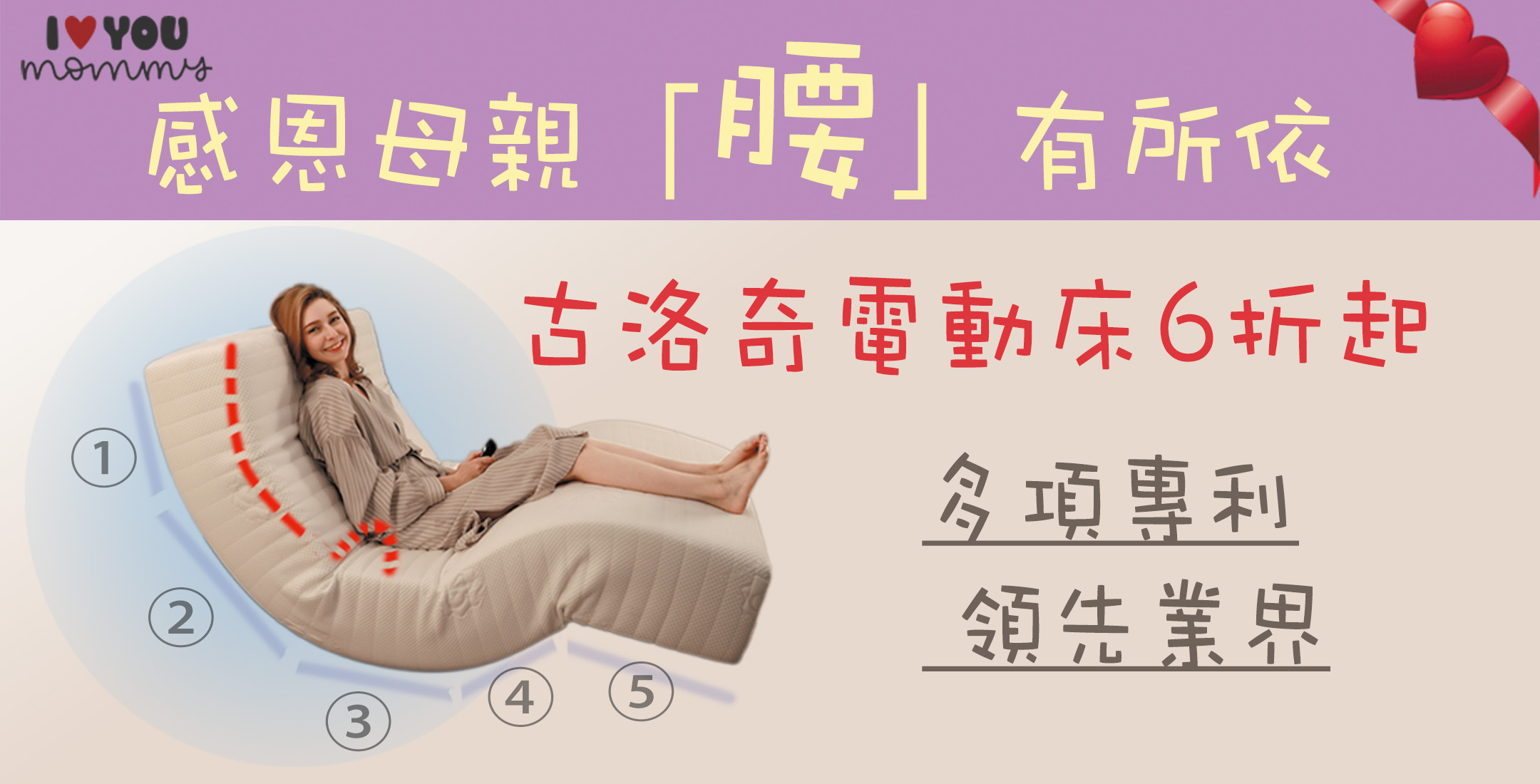 感恩父母,健康最重要。幸逢感恩季節,領先全球電動床專家~古洛奇智能升級(獨家起身鍵+獨家多角度頂腰支撐結構)特別隆重推出「我愛媽媽專案」,快趁著優惠期間,來古洛奇選購最優質的電動床,給媽媽一個護腰紓壓的高品質睡眠。