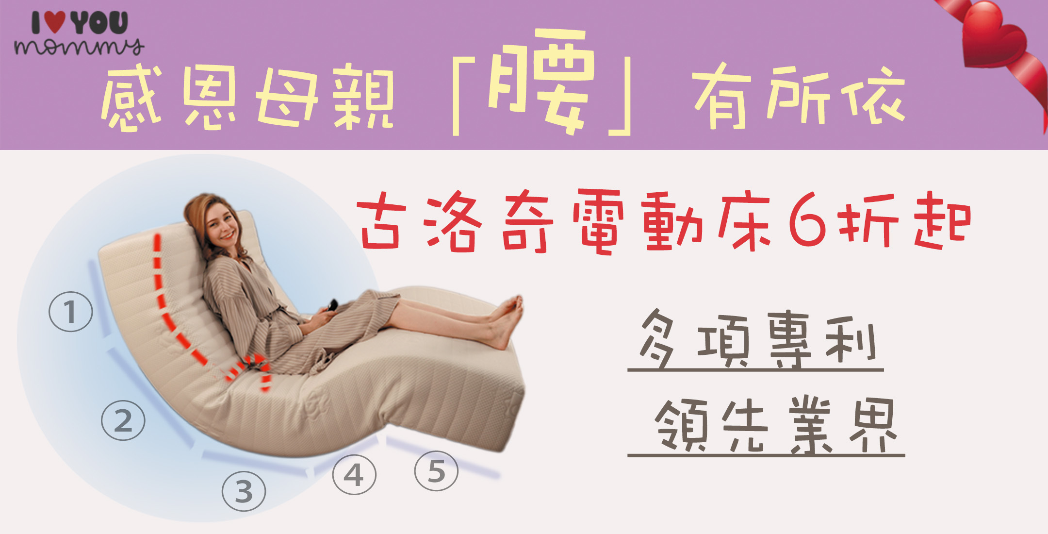 感恩父母,健康最重要。幸逢感恩季節,領先全球電動床專家~古洛奇智能升級(獨家起身鍵+獨家多角度頂腰支撐結構)特別隆重推出「我愛媽媽專案」,快趁著優惠期間,來古洛奇選購最優質的電動床,給媽媽一個護腰紓壓的高品質睡眠。
