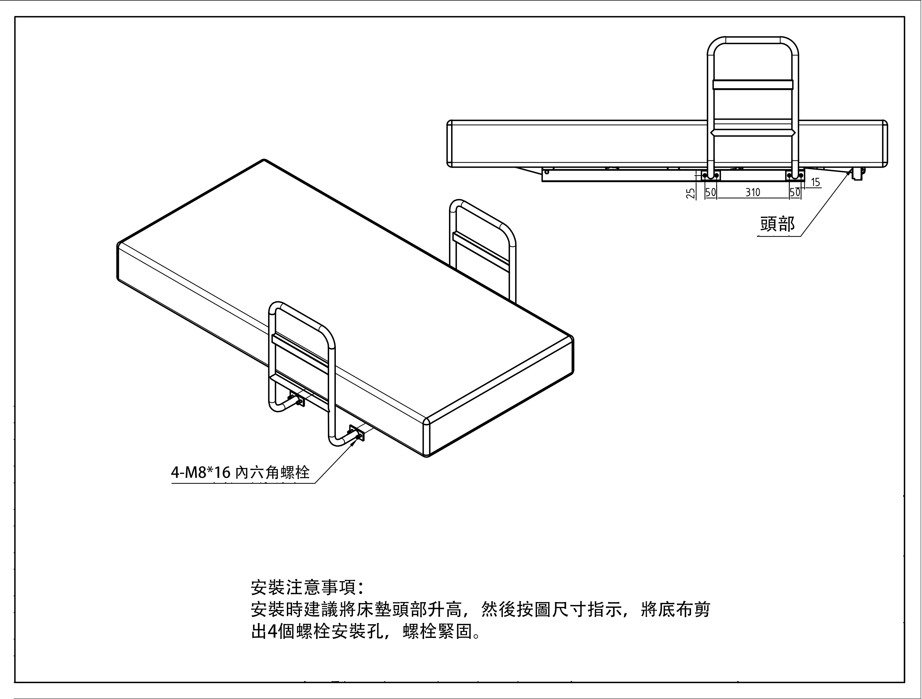 專為床墊型電動床設計的專用護欄,直接鎖在床墊的鋼骨上,不破壞床架及床墊,完美結合古洛奇電動床墊。